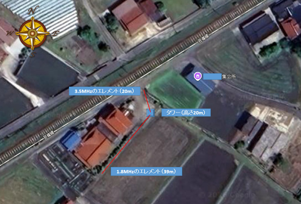 1.8MHzは不本意ですが物理的に南西方向に張るしかありません。でも、スローパーアンテナ自体あまり鋭い指向性は出ないとう認識ですので、そこそこ使えるような気がします。(たぶん、きっと)